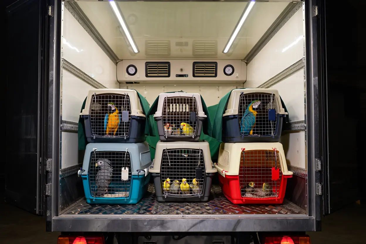 A correct travel crate is essential for maintaining calm behaviour during long flights. We prepare IATA-compliant crates suitable for parrots of all sizes, ensuring necessary ventilation, perches, absorbent flooring, and stable interior placement.